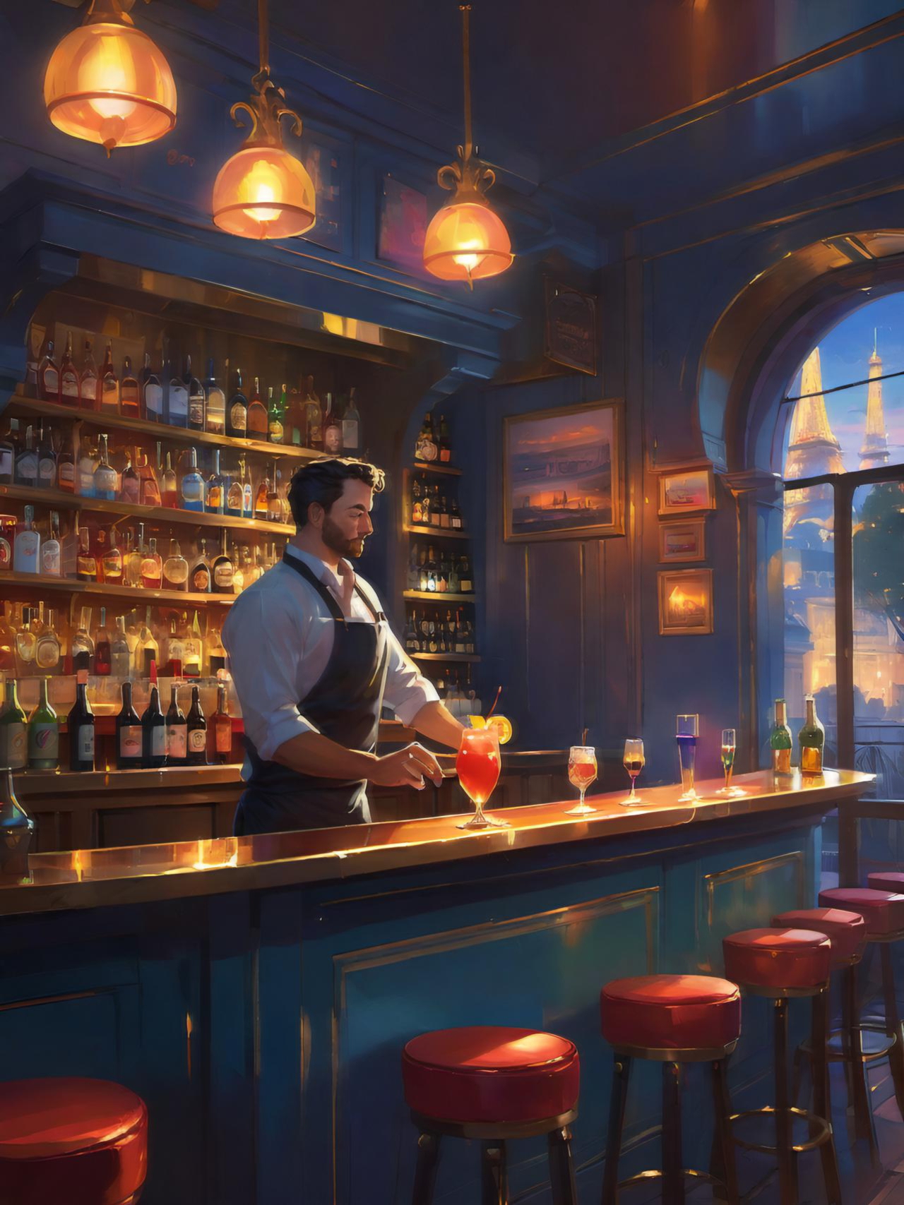 The bartender seemed completely absorbed in mixing different cocktails, which he tasted himself, critically.